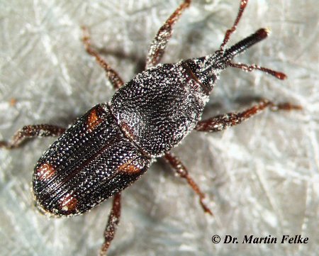 Der rund 3 mm lange Maiskäfer (Sitophilus zeamais)hat rüsselförmig verlängerte und nach unten gebogene Mundwerkzeuge. An der Basis dieses Rüssels sitzen die seitlich abstehenden Fühler.